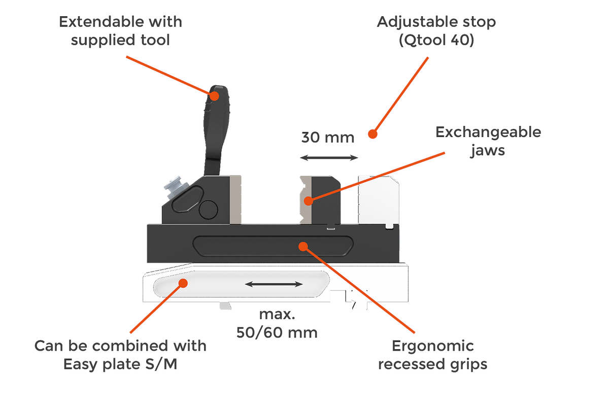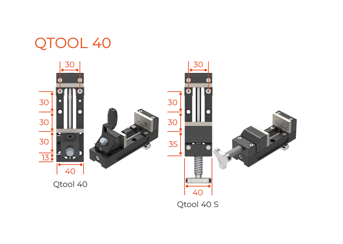 | Qtool 40 | 0 - 60 mm | 50 mm | 25 mm | ca. 1000 N | Qtool 40 S | 0 - 50 mm | 50 mm | 25 mm | 可变 |